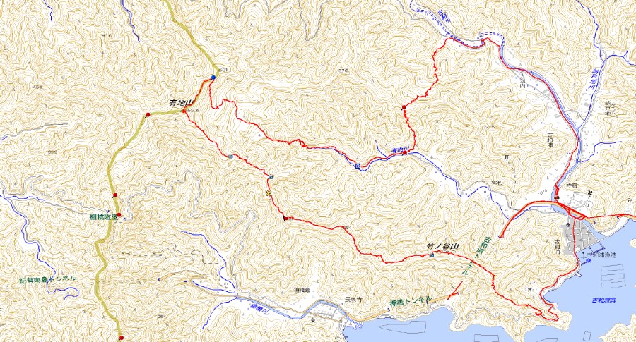 【 ルート 】古和ふるさと公園P7:30―古和川離れる8:30―尾根乗っ越し9:00―有地川へ下降9:33―有地山12:00~13:00―竹ノ谷山13:50―ニラハマ展望台14:35―古和ふるさと公園P14:56