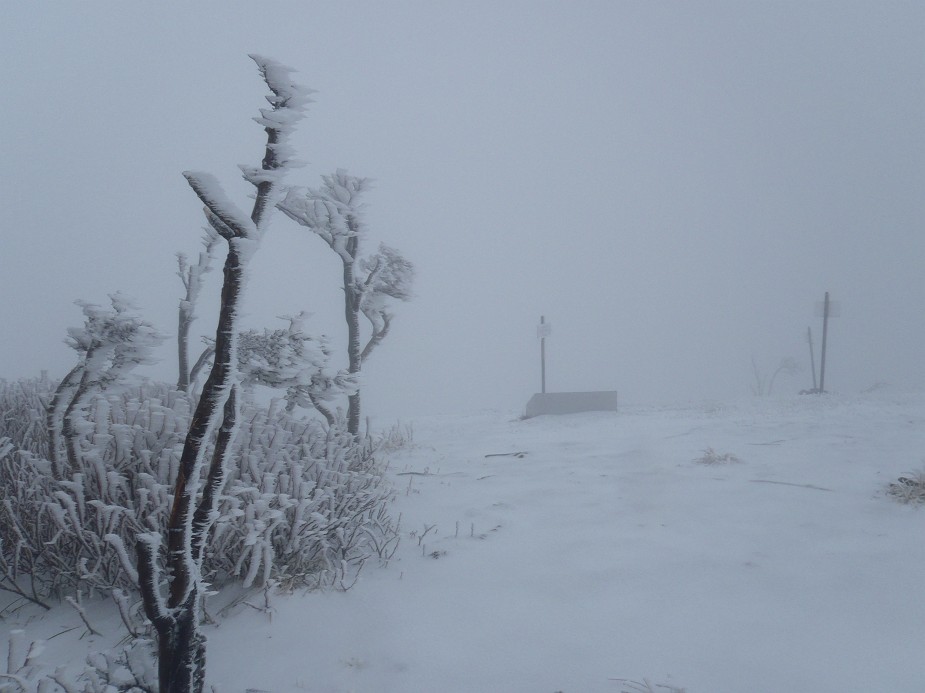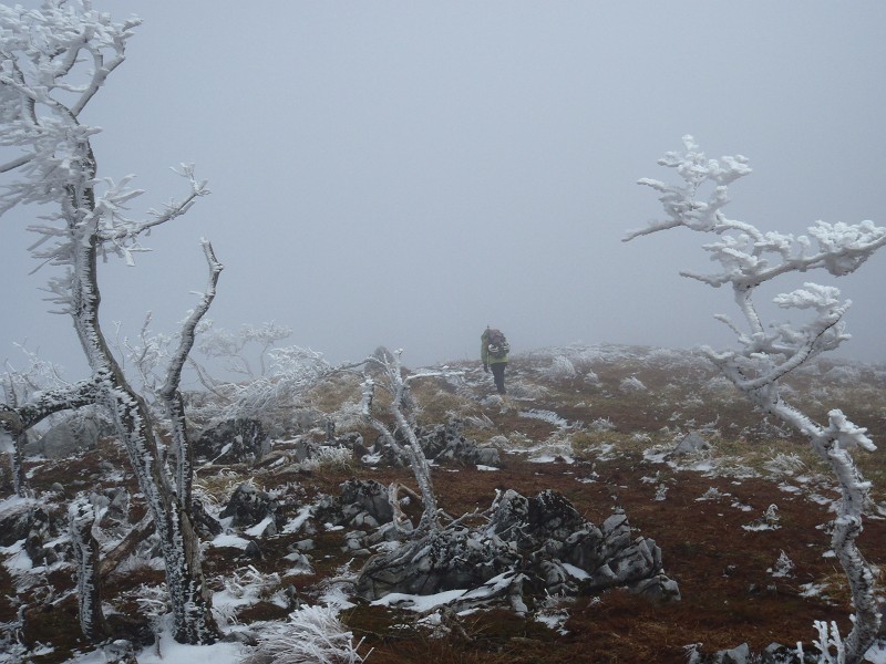 鞍部は、風が強いのか雪が解けて地面が出ている。この頃、ガスが抜け始め、一瞬樹氷が輝きを見せた。