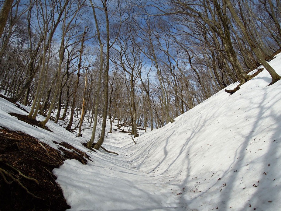 この尾根は尾根然している間は、尾根芯は雪が解けて歩けたが、尾根が稜線に吸収され始めると、グサグサの深い雪が付き、雪を踏み抜いてしまう。