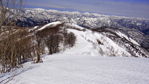 それにしても長い長いアプローチですねえ。昨年は浅又川沿いの鳥越林道をだいぶん入ったので、標高点1039より北は様子が分かりませんアップダウンもきつくないし、雪さえ締まっていたらしんどくないですよ。これホントです。景色も良いし(^^)