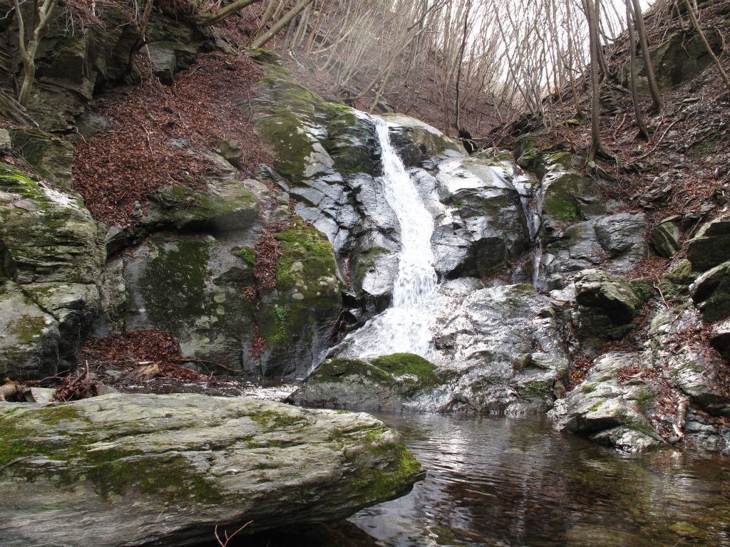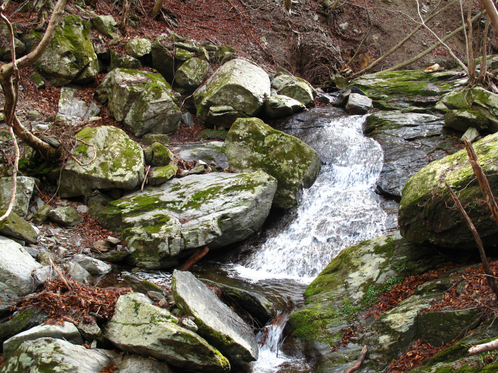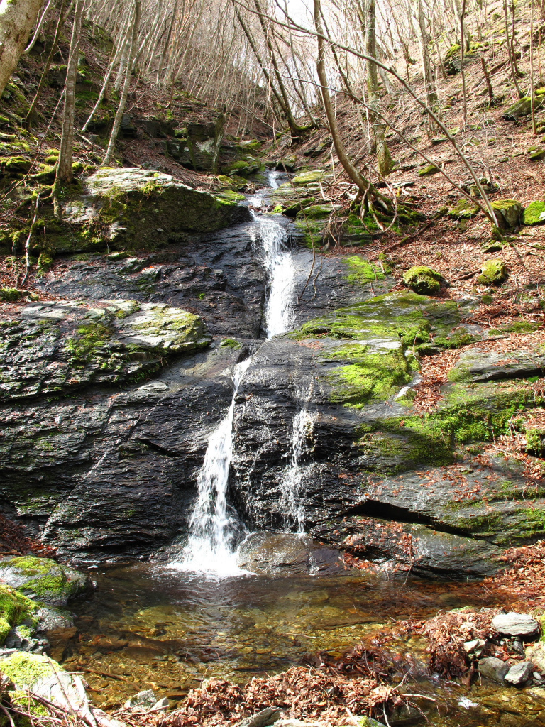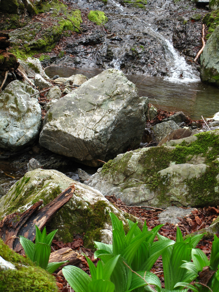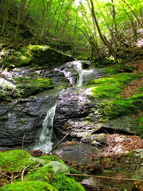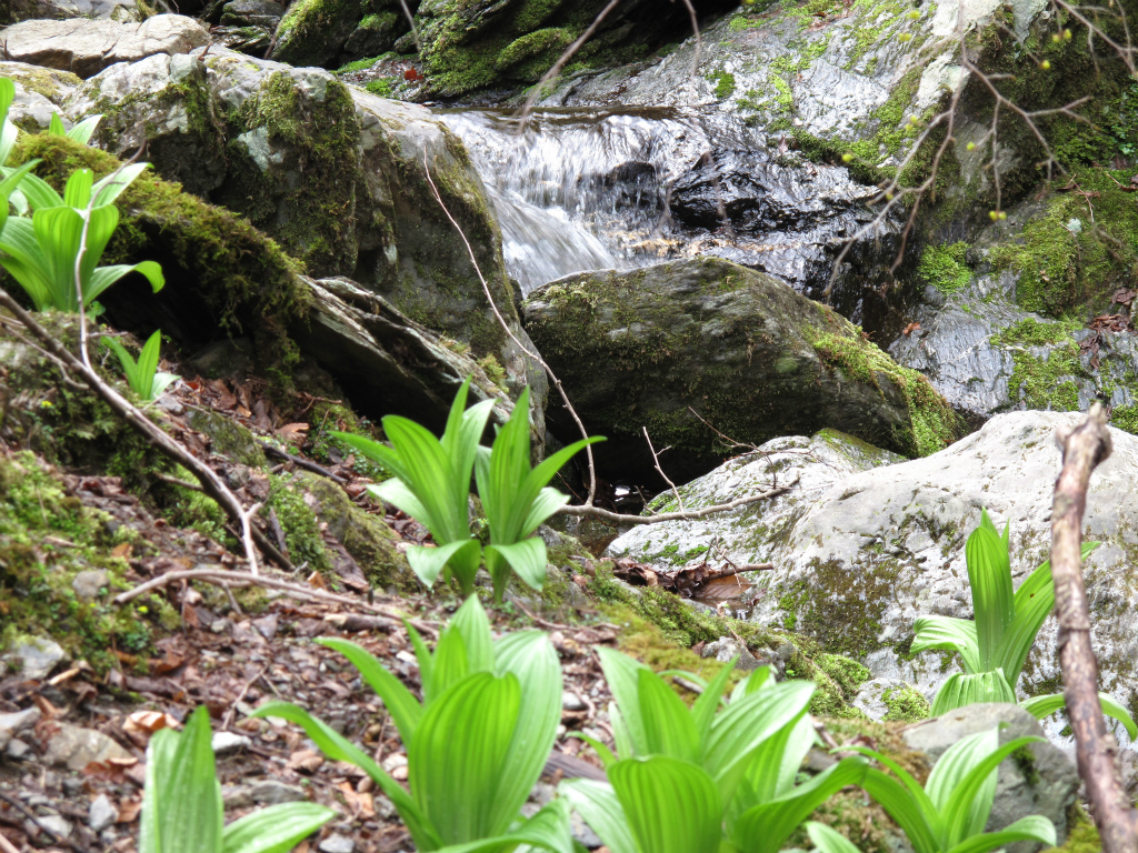 標高890mで右に分ける支谷を見送ると、見ごたえのある滝が次々と出てくる。広い斜瀑やスラロームのように緩やかに曲がった滝が目を楽しませてくれる。ここを過ぎると谷は広くなり、いくつかの窯跡があらわれ、水辺にはバイケイソウが葉をひろげている。二次林が続き明るい谷だ。陽光に照らされて草木が茂り、春の息吹を感じさせてくれる。