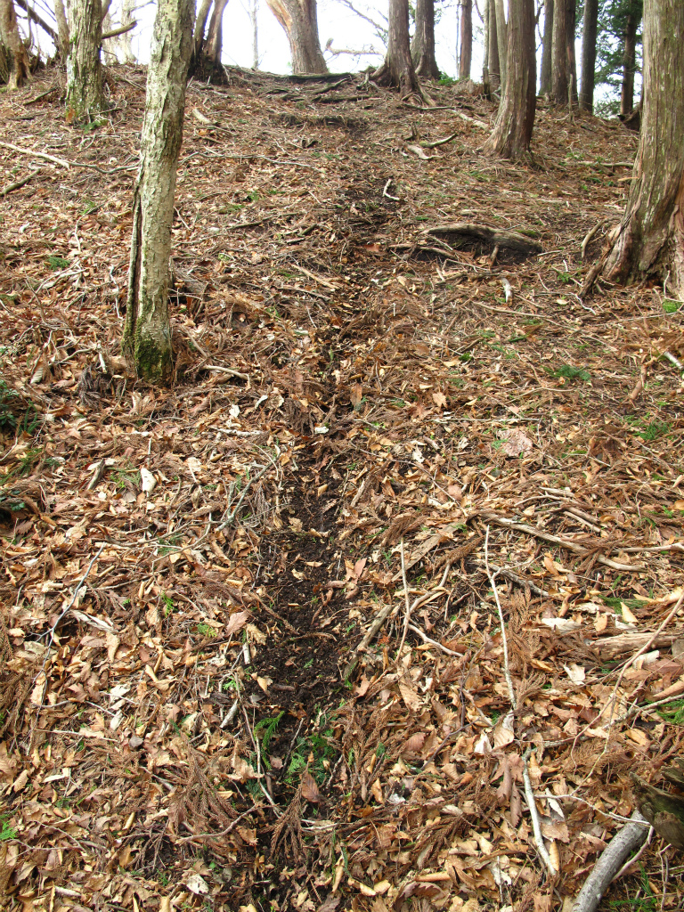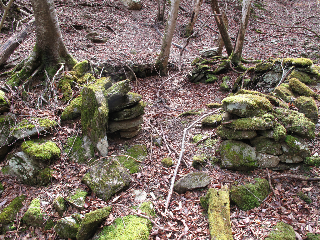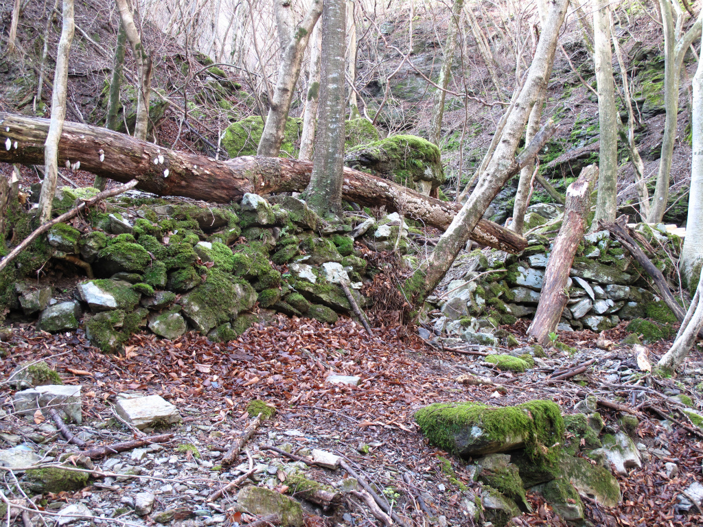 ここにも窯跡がいくつかあり、窯跡は頂上直下の1095m地点まで続いていた。窯をつなぐ古道は谷の左岸につけられていたようで、所々にその痕跡が残っていた。