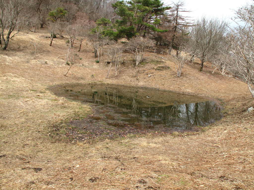 時間も早いので、周回して帰ることにする。木梶山から馬駈ヶ辻に向かうと木原谷の源頭部の大木が存在感を示している。尾根の雪は消え、国見山も一部に雪を残すだけになっている。ハートの形をした赤ゾレ池を見ていると、エンジン音がしてきた。以前釣り尾根で出会った二人組だ。どうやら今日はハンシ山の向こうから赤ゾレ山を越えて来たようだ。赤ゾレ山の上りにかかったところで、二人組は赤ゾレ池を通過し馬駈ヶ辻に向かって行った。モトクロスバイクですか。多度山では良く見ますけど、台高でもいるんですね。せっかく静かな山歩きを楽しんでいるのに、興ざめですね。モトクロスはモトクロス場だけにしておいてもらいたいもんです