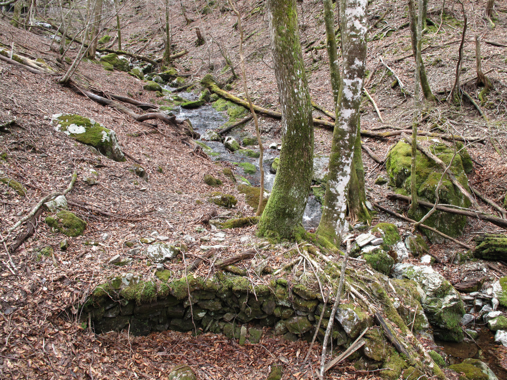 この滝をこえると再びゆったりとした谷にもどる。ここにも窯跡がいくつかあり、窯跡は頂上直下の1095m地点まで続いていた。窯をつなぐ古道は谷の左岸につけられていたようで、所々にその痕跡が残っていた。せせらぎの聞こえる谷は、野立が似合いそうな場所だった。抹茶セットを持ってこなかったのが悔やまれる。