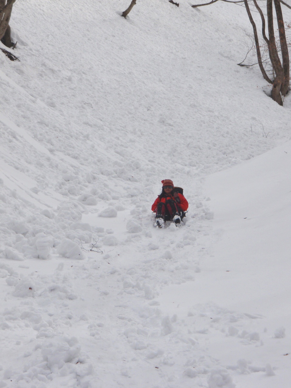まだこの先も場所を選んでは、シリセードで滑るりゅうさん。よほどシリセードが好きな様子。歩きにくいコグルミ谷を下って、駐車場に着いた。