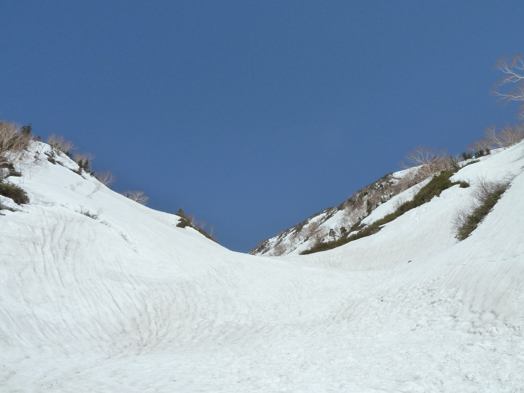 巨大なハーフパイプの底を行くような感覚の源頭部だ。両岸の尾根近くにはダケカンバの白い枝が真っ青な空に伸び、