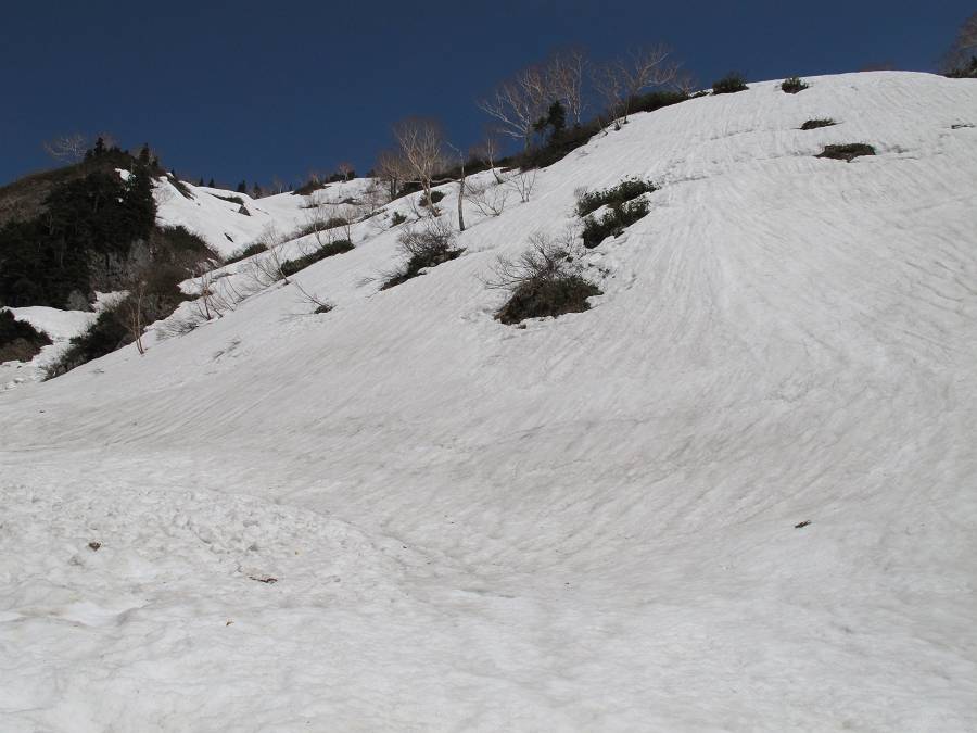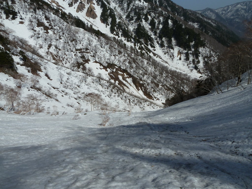 面なのだろうが、緩み切った雪はシリセードも不可能。ツボ足でずぼずぼ潜りながら重力に身を任せる。