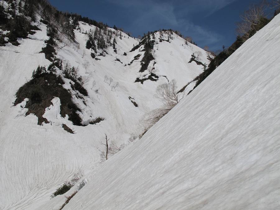 相当な急傾斜だが午後の腐った雪にかかと落としのステップで問題なく下ることができた。雪が締まっていればかなり恐