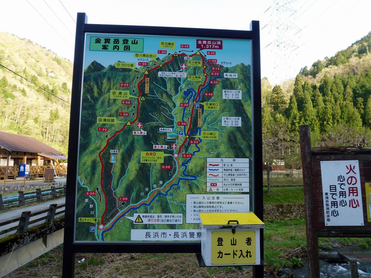 で気をつけるように忠告を受け、金糞岳登山案内図をもらった。キャンプ場に裏手に登山口があり、ちゃんと標識も出ている。すぐに送電