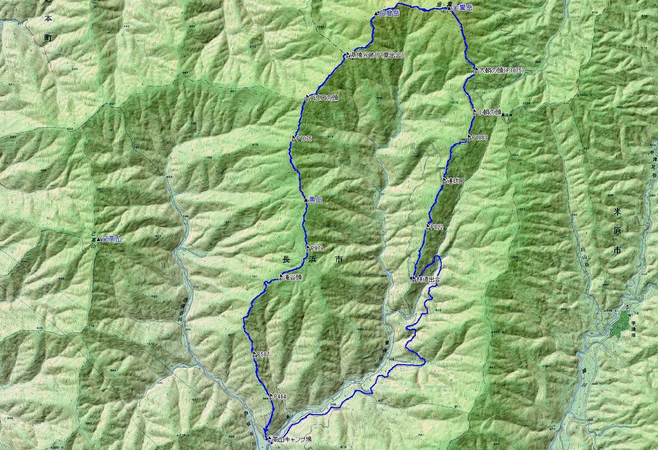 奥山(1056.5m)-ゴロウの頭-八草出合(県境尾根)-白倉岳(1270.7m)を経て、金糞岳山頂に達し、中津尾を下るという周回コース
