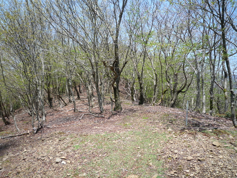 ヒキノの手前にくると、気持のよい二次林が広がる。開けた台地状の草地でお昼にする。暖かい。新緑の緑が目に優しい。目の前には静が岳と銚子岳が大きくそびえている。鈴鹿では目立たない山で、登る人も比較的少ないが、こちらからみると良い形をしている。