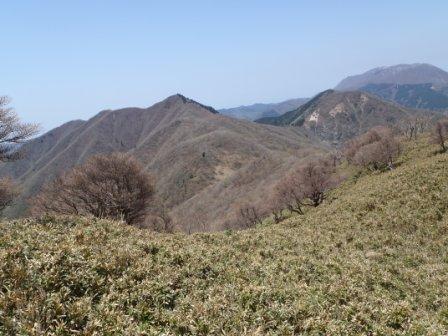 ヒキノの頂上は展望はないが、二次林が広がり気持のよいところだ。進行方向の左には天狗堂が、右には静が岳と銚子岳、進行方向には藤原岳と、土倉岳、さらに御池のテーブルランドが見える。いつもとは違う方向から見るこれらの山々の姿が新鮮にみえる。