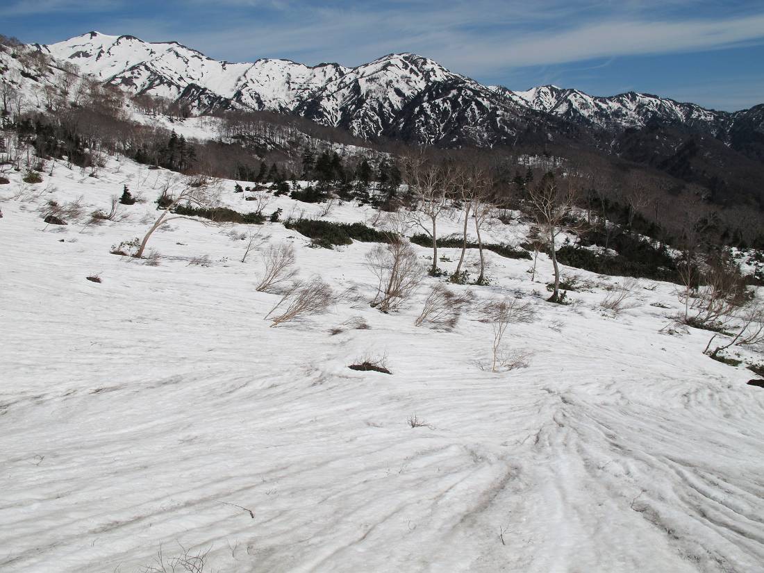 別山、南白山を眺めながらの下りは気持ちいいが、きちんとルートを考えて進まないとヤブに捕まってしまう。完全に雪に埋まってないんですね。