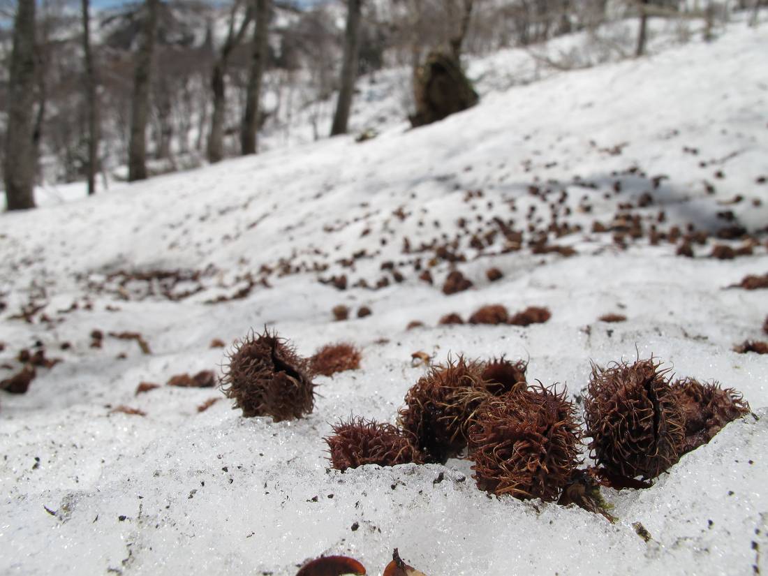 1,529mの標高点を目指して歩けば雪の上にはブナの実(殻)が無数に散りばめられている。