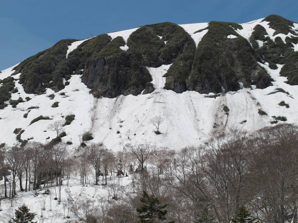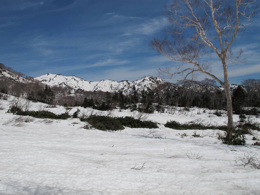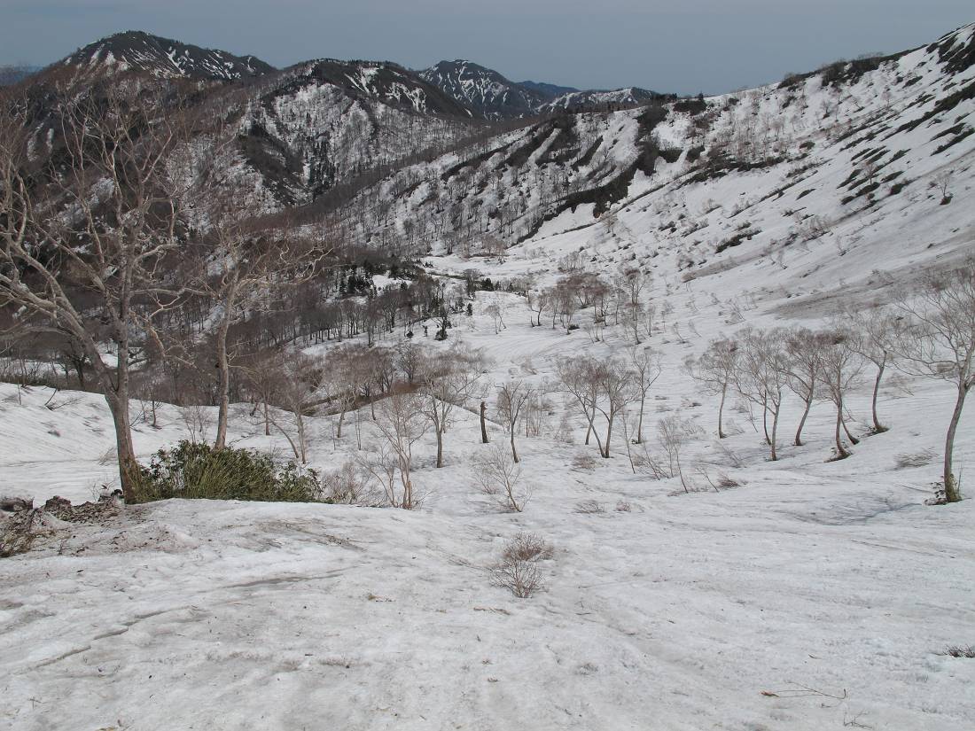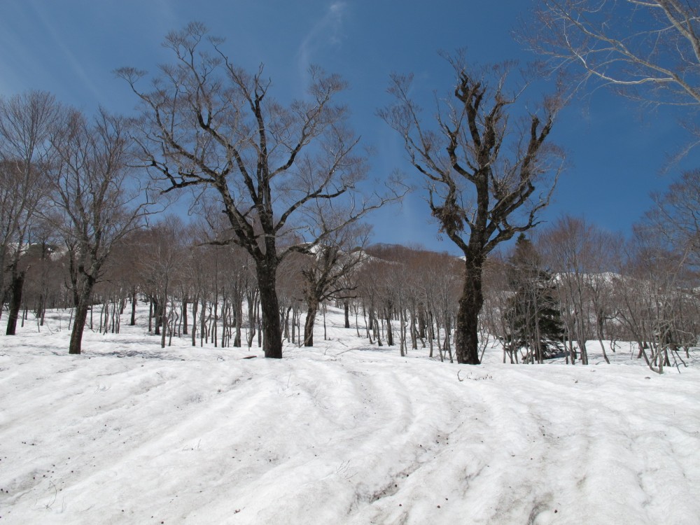 銚子ヶ峰東壁直下は雪崩のせいでダケカンバが少なく雪原が広がる。