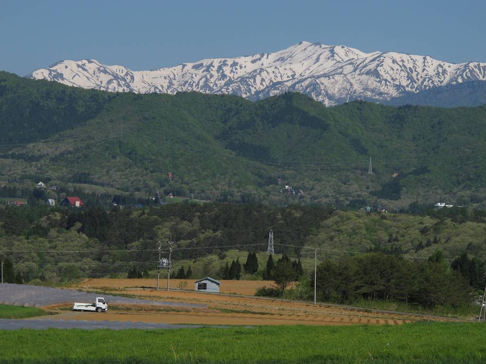 振り返れば尾上郷の新緑、その向こうには御岳、乗鞍が望めるというロケーションだ。
