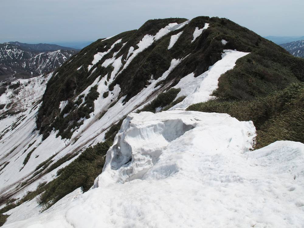 ピッケルにストック、アイゼンといういつもの出で立ちで最後の急登を登り切ると、雪庇越えに苦労することもなく主稜線に出た。