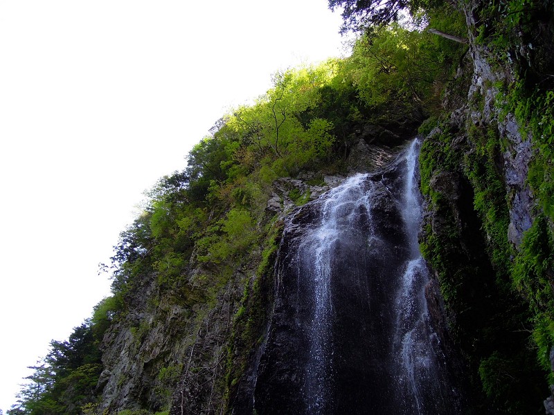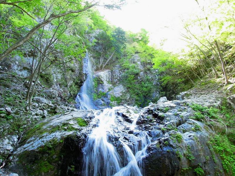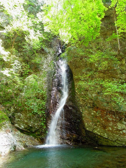右から枝谷が入りその向こうに滝が見えた。滝口に石を詰め二筋に分かれた水流が合流し、岩をハーフパイプ状に穿い、身をくねるように落ちる大きな釜を持った美瀑だ。滝前にはカエデの木があり、紅葉の頃に訪れればさぞきれいだろう。