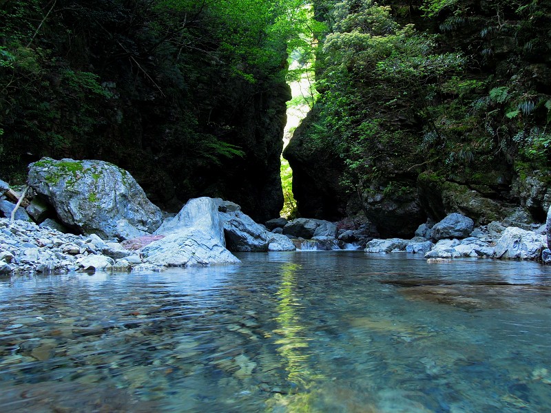 何度来ても、行合では時間をとられてしまう。両岸迫り、僅かにのぞくスリットには陽を浴びて光り輝く新緑。そしてそれは水面にも映え、黒い岩壁と相まって美しい。