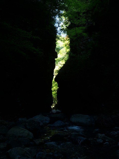 バシャバシャと通り過ぎるには雰囲気が良すぎます!(^^)!何度来ても、行合では時間をとられてしまう。両岸迫り、僅かにのぞくスリットには陽を浴びて光り輝く新緑。そしてそれは水面にも映え、黒い岩壁と相まって美しい。