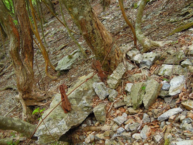 途中、ここまで何度か見たバンセンに小さな滑車が二つ掛かり放置されているのを見た。これは、たぶん炭焼きの人たちが使ったバンセンであり滑車だ。俵に入れた製品をバンセンの索道で降ろしたのだろうと思う。