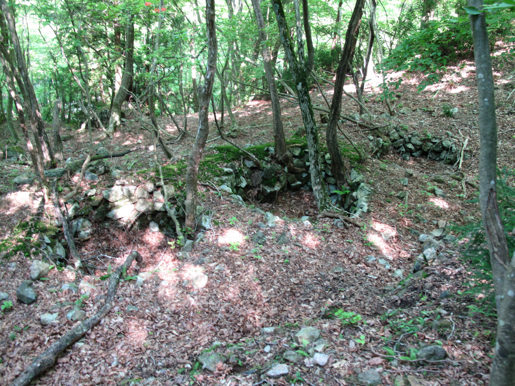 最初に国位鉱山に向かう。国位鉱山については、大正3年には操業が停止された事はわかっているがそれまでのくわしい経緯はわかっていない。PCで検索してもハリマオさんのレポが上がってくるのみだ。出合からコクイ谷登山道の右岸を進み左岸に渡り再び右岸に渡った場所に石積みがある。ここには、炭焼窯のような窯跡と鉱石の焼窯のような四角の石組が残されている。ここを上っていくと上部にも石積みがある。近づいてみるとただの石積みではなく、連なった焼窯だった。三鉱谷の三神谷口にある連なった鉱石を製錬する焼窯と同じだ。日ノ岡などにも連窯は残っているが、これだけしっかり残っているのは三神谷口とここだけだろう。四連の焼窯で、三神谷口より規模は小さいものの石組としてはこちらの方がしっかりしている。記録には残っていないが、ある程度の採石量を期待して精錬所を作ったようだ。少し上ると高台に石積みがあり、何らかの建物があったようだ。ここからは対岸の高昌山とP872のがよく見えた。上部を探るが、鉱山跡らしき物は見つけられずに焼窯に戻ると通風山さんが現れた。武平峠からみえたようで、焼窯を一緒に見てオフ会場に向かった。