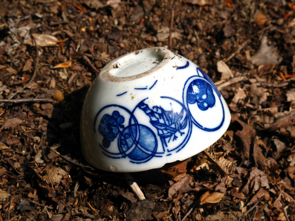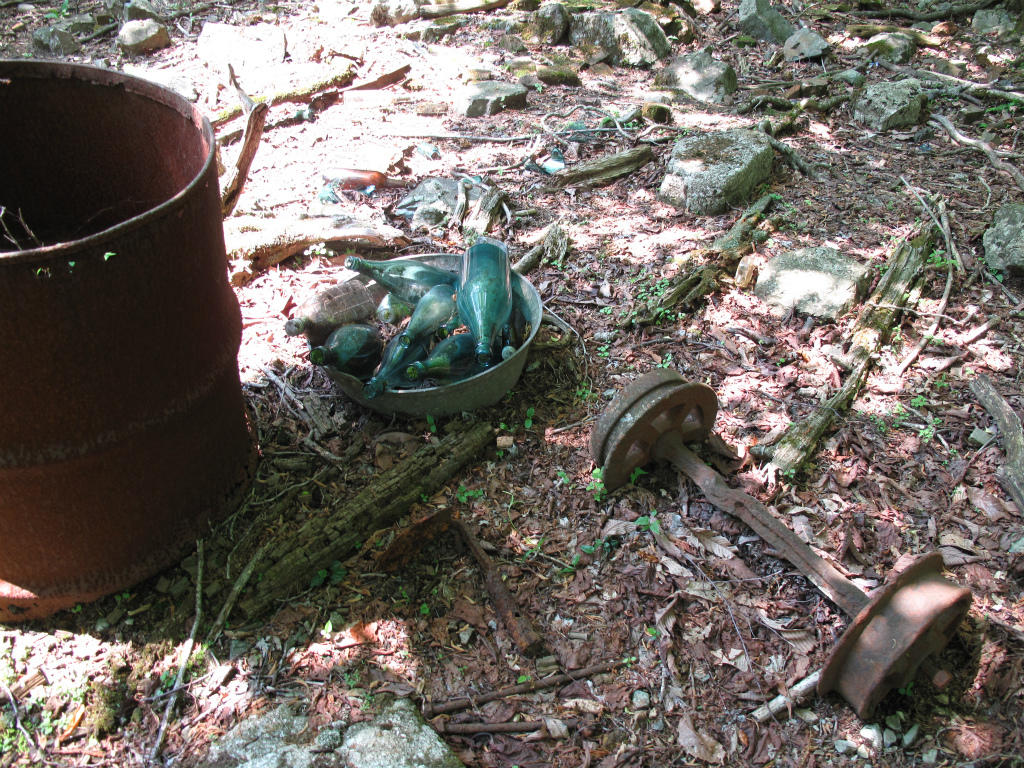 石積みを上って行くと、段々畑のように石段が続いている。上部には茶碗や一升瓶などの生活用具にトロッコの車輪が残されていた。この場所の谷側には精錬のさいに出るくず鉄(カラミ)をうず高く積み上げたボタ山があった。この横には国位鉱山のような連窯ではないが、四角に掘られた石積みのスペースがありここで精錬をしたようだ。そして、この上部には1本だけ大木が残されており、これが鉱山の鎮守の木なのだろう。