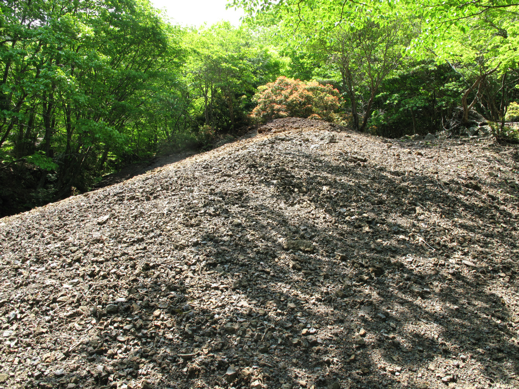 この左手には石積みがなおも続き、住居跡がある。これまでの石積みとは違い、小屋のスペースに応じた小さな平地と石積みが何重にも続いている。右手のスペースに精錬所などの大規模な建物があり左手のスペースが住居となっていたようだ。新たなボタ山を見ながら住居跡を上っていくと最上部に大規模なかまどの跡がある。そういえばここの住居跡にはかまどの跡は無かった。どうやら最上部のかまどで一括して食事などを作っていたようだ。かまどの上には精錬の焼窯が残されていた。右手の精錬所跡と最上部の焼窯は時代が違うようで、最上部の焼窯の方が時代が新しくしっかりしていた。