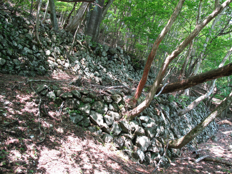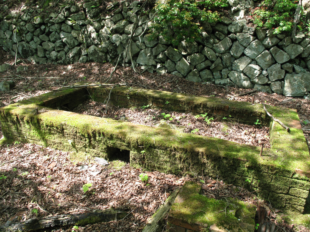 ここには、炭焼窯のような窯跡と鉱石の焼窯のような四角の石組が残されている。ここを上っていくと上部にも石積みがある。近づいてみるとただの石積みではなく、連なった焼窯だった。三鉱谷の三神谷口にある連なった鉱石を製錬する焼窯と同じだ。