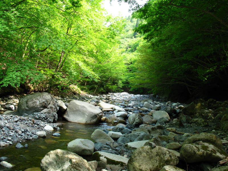 千種街道の歩きやすい新緑の道が続いており、ようやく汗も引いてきた。雪山ではトラバースした斜面にもしっかりとした道があり、コクイ谷出合の手前には、冬には無かった神崎川を渡る橋がかけられていた。