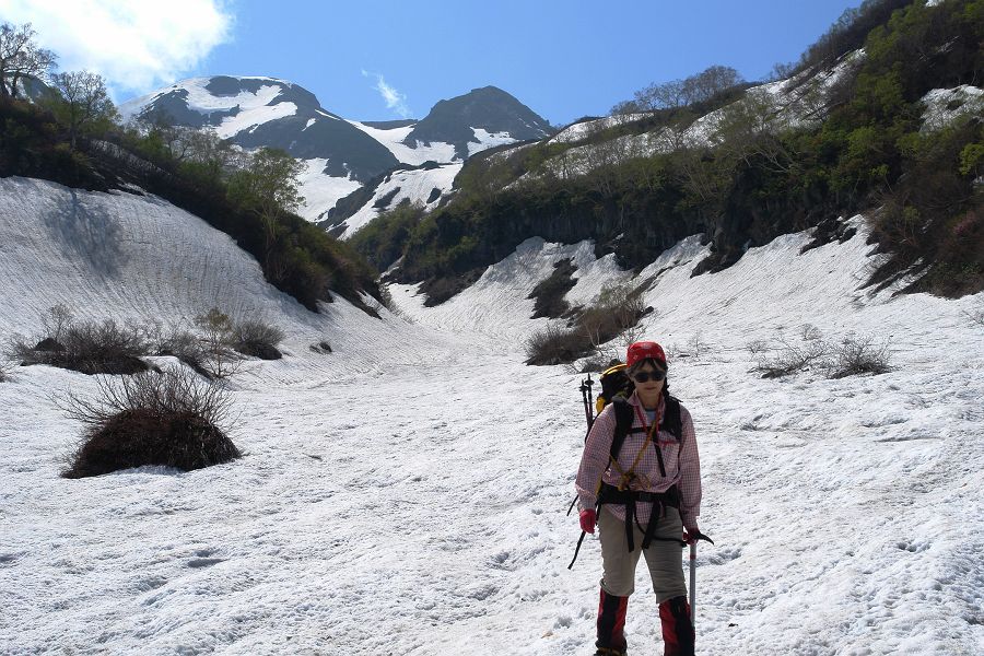 小屋の先はササの北側斜面が雪に埋まり、そのまま谷筋へ下れそうだ。ルンルンで進んで行くと傾斜がきつくなる。こりゃちょっとヤバそう(@_@;)ってことで左へトラバース。やや上流から大白水谷へ降りる。あとは二股まで雪の谷筋を下るだけ。さてその二股はどこや?(実は下ったところも二股なんです。)
