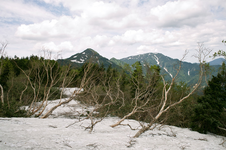 山頂は当然のごとく展望もなんもありません。少し戻って、山頂付近の東側斜面で休憩です。草地と小さな残雪があります。もう7月ですがカタクリが花を咲かせていました。大量の虫も飛んでいますし、時間も十分にあるわけではありませんので、ぼちぼち下山します。 山頂の北側斜面にはまだたくさんの残雪が残っていましたので少し立ち寄ります。雪の上からの眺めもよく、気持ちよくテントを張ることもできそうです。下部の雪が溶けきってしまい、稜線上に雪が所々残っているぐらいの時期が一番よさそうです。 あとは来た道を引き返すだけなのですが、登りで明瞭に感じた場所も下りでは多少迷ってしまいます。ひたすら歩いて歩いてようやく桂橋に到着。