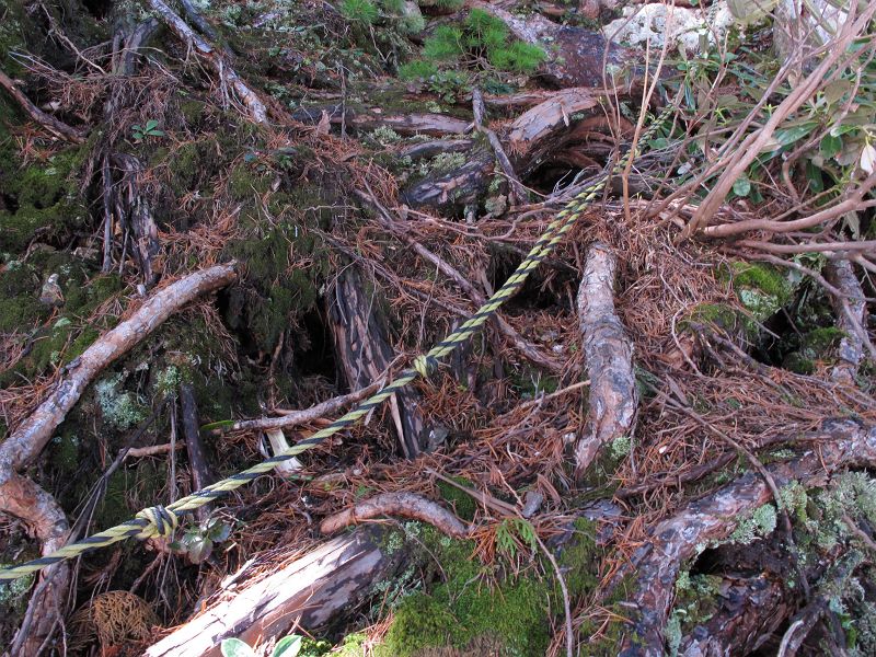 急な斜面を登って行けばトラロープ。。。三角点を捜索しましたが見つからず、そのまま進みます。このロープにも驚きでした。