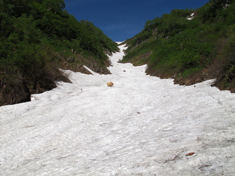カンクラ雪渓を目指して二俣を右に入ると雪渓は大きくカーブする。