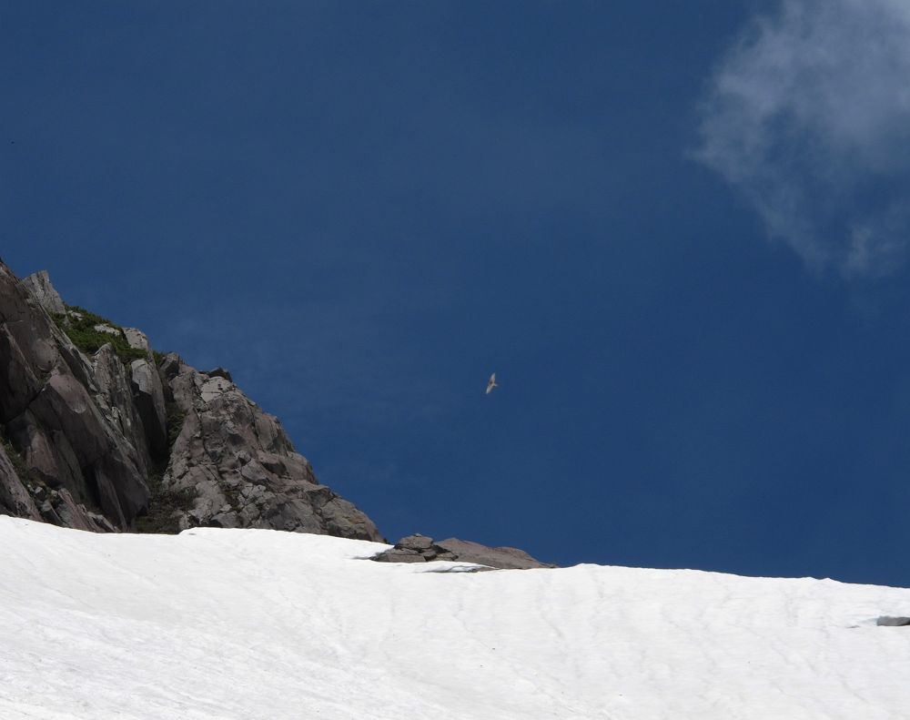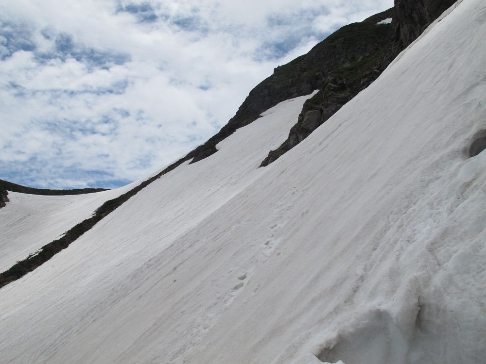 岩場に近づくと斜度が一気に増し、見下ろす転法輪谷は標高1,600m付近までずっと雪渓が続いている。