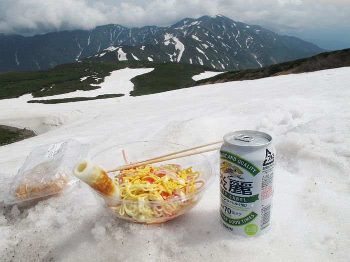 肴は別山、南白山、焼滑・・・雪渓でキンキンに冷やしたビールが旨い、う~ん最高。