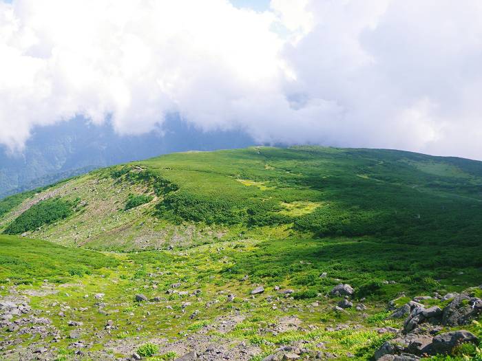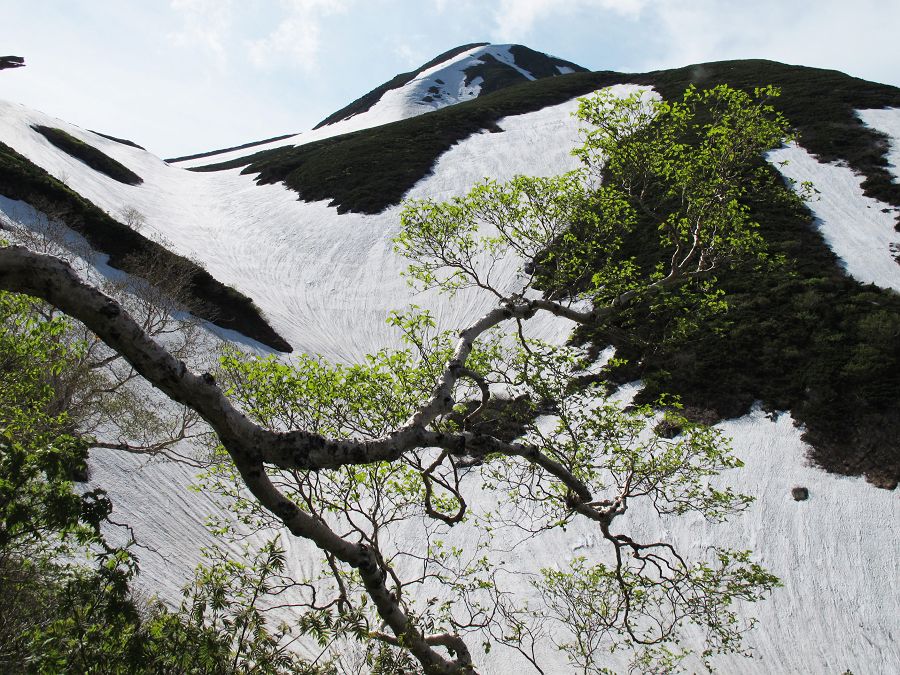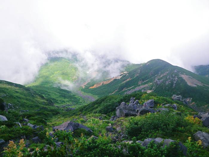 雪渓の周囲に咲いていたサンカヨウ、キヌガサソウといった花は標高2,000mを越えると姿を消した。