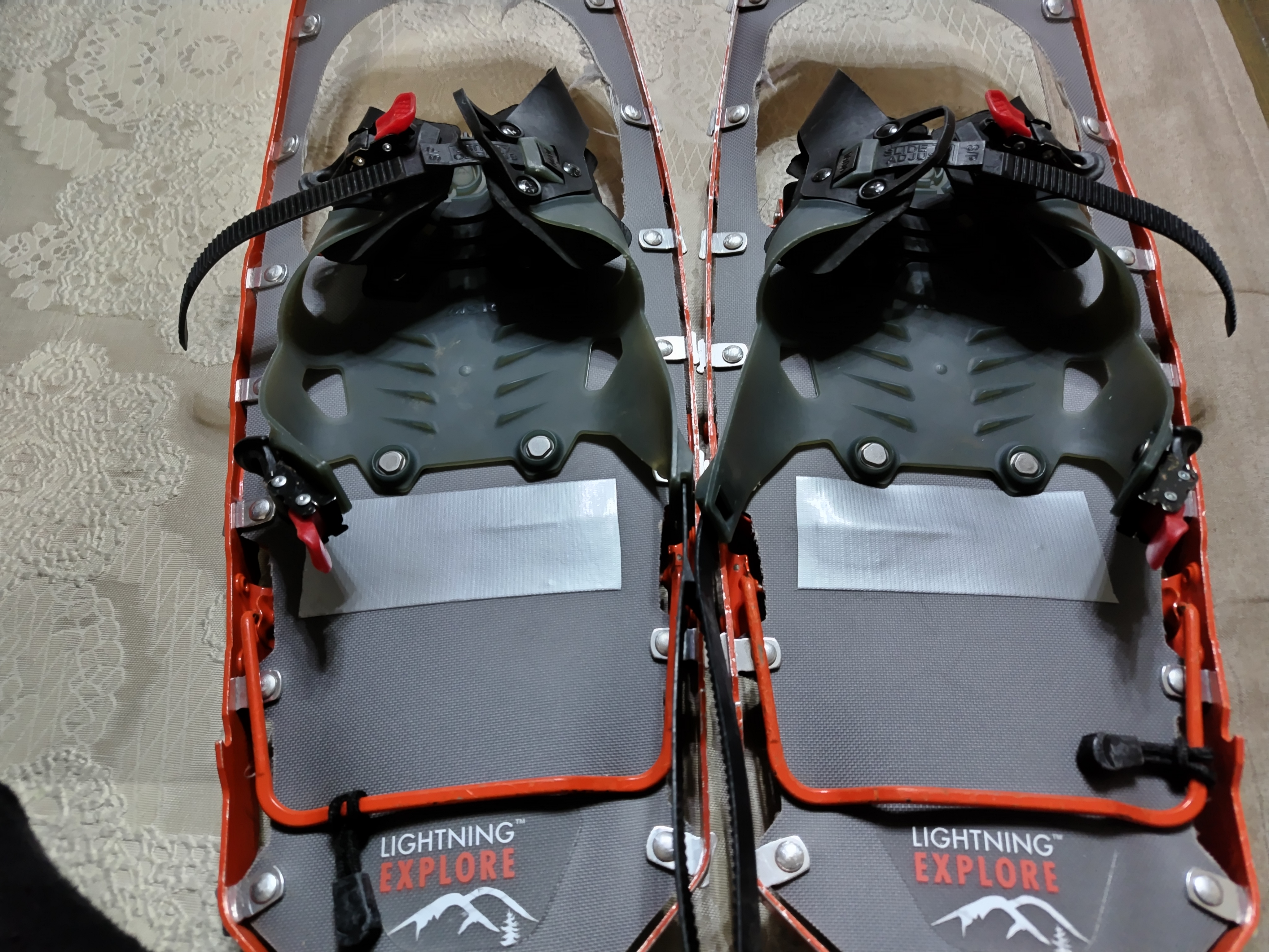 やっぱりダメかと思ったが、スノーシューのフレームの方にもテープを貼れば、フレームの当たりも緩和されると考え、そちらにも貼ってみた。しかも、枠も、シートの裏も表も全部2重に貼った。フレームと靴の間に、合計6枚のゴリラテープが貼られたことになる。それで登山に。2回の登山(三国岳・左千方・夜叉丸、猿ヶ山)を経験したが、テープは破損無し。やっと成功した。