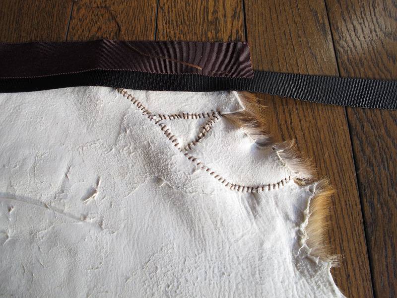やっぱ紐はワラか麻縄にして欲しかったなあ。余った皮を紐にするとか。ま、バックルのほうが便利だけど。シカ皮の形が整ったら腰紐となるテープの縫い付け作業に入る。