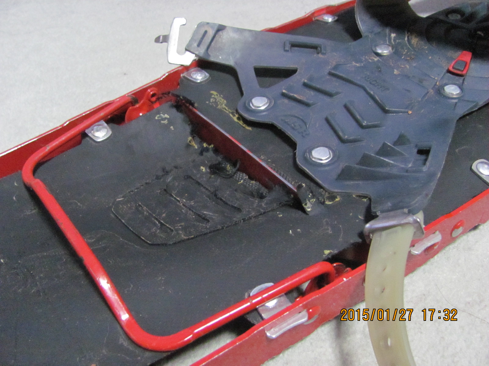 僅か1ミリの厚みしかないデッキで浮力を得られるこのタイプのスノーシューも、4シーズン目を迎えた今季は痛みが目立ってきた。機械的性質の優れた材質とは言え、踵の下にフレームがあることから大きく裂けている。
