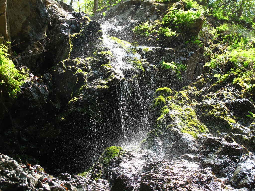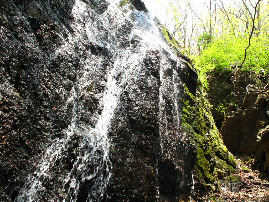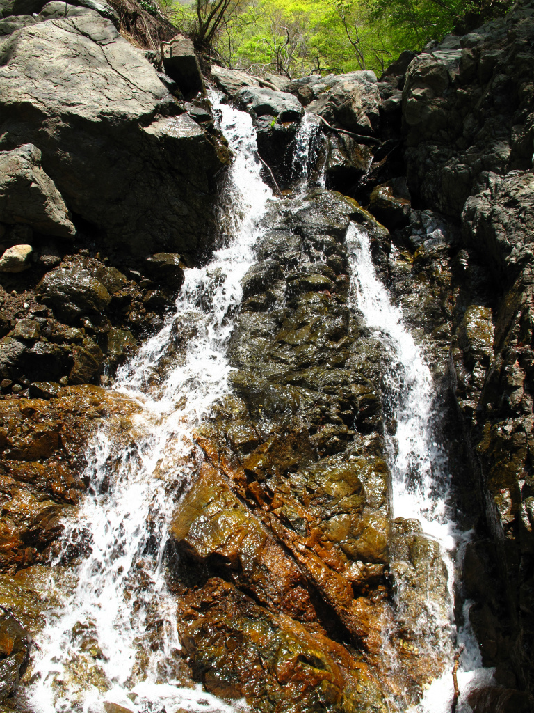 滝をつつむ岩の色は石灰の白や鉱物の赤茶けた色に黒と様々な変化を見せてくれる。源頭部には8mの黒い壁から簾上に水が流れ落ちるがかかっていた。これまで切り立った両岸を探りながら歩いてきたが坑口や水抜きの穴などは発見できなかった。
