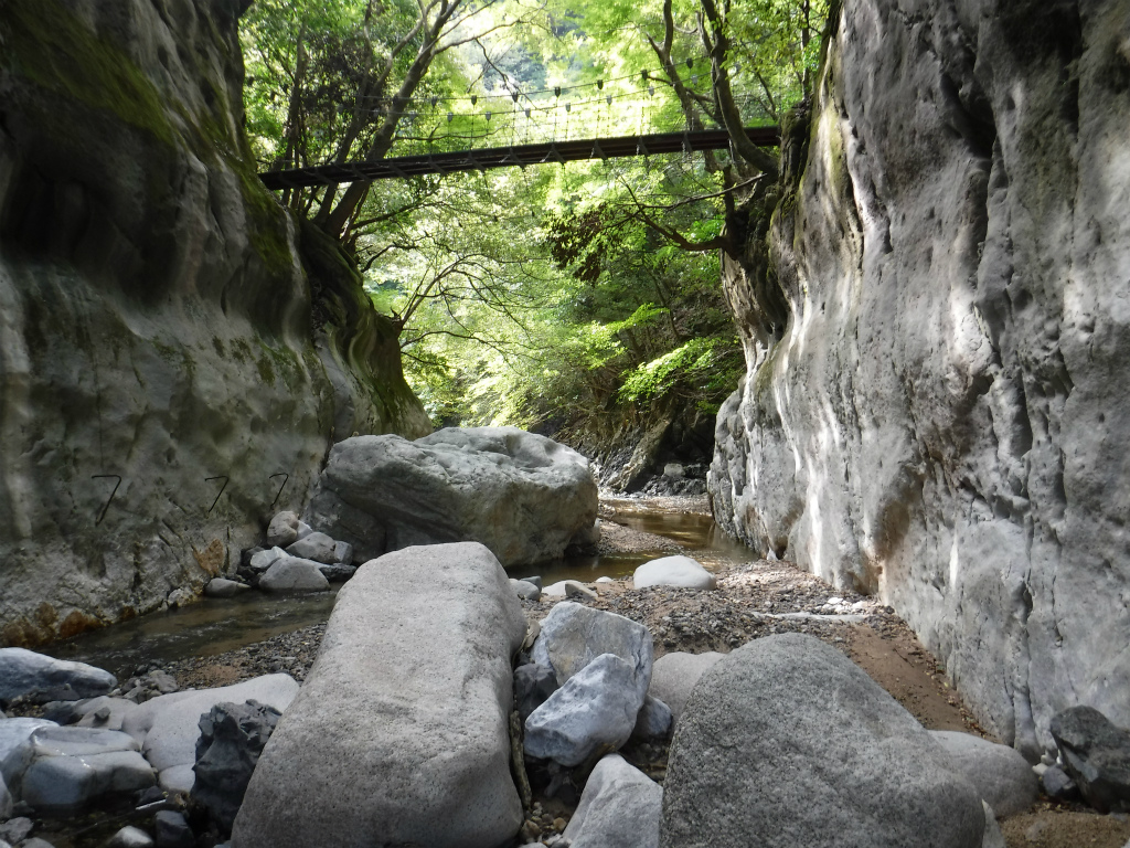 両岸が立ち深みを増すはずも普通に歩き、上に吊り橋を見ると屏風岩の廊下なのだがここも土砂の上を歩くだけ。屏風岩を通りすぎ堰堤を右から巻き小岐須渓谷最後の難関の大釜を持つ4m滝に望みをつなぐ。ところがここも釜はうまっており普通に上れた。