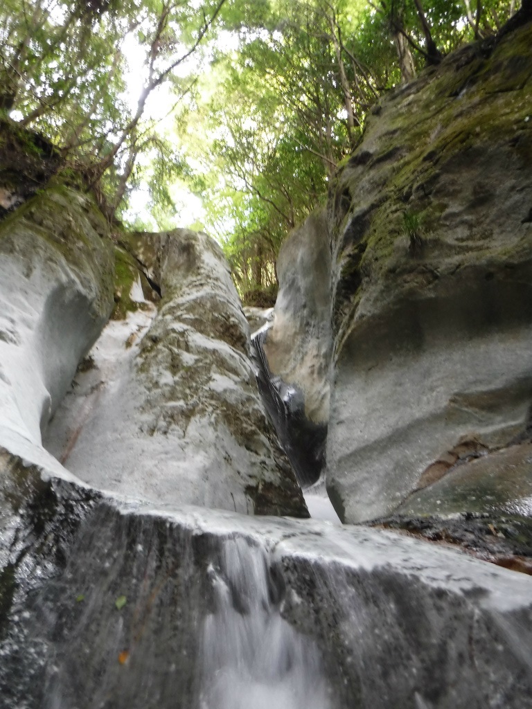 すぐに右岸から一ノ谷が合流してきてスリバチ滝を見に行く。廊下の先に3段10mの滝が流れている。流れに磨かれた石灰岩の白が目に飛び込んでくる。石灰岩に溝をつけながらスラローム状に流れて落ちており独特な形をしている。水量が多い時は取り付く島もないのだが、今日の水量なら二段目まで上がれそうだ。石灰岩の溝は、グリップが効いていていい感じで、一段目に取り付くのに初めて泳いだ。