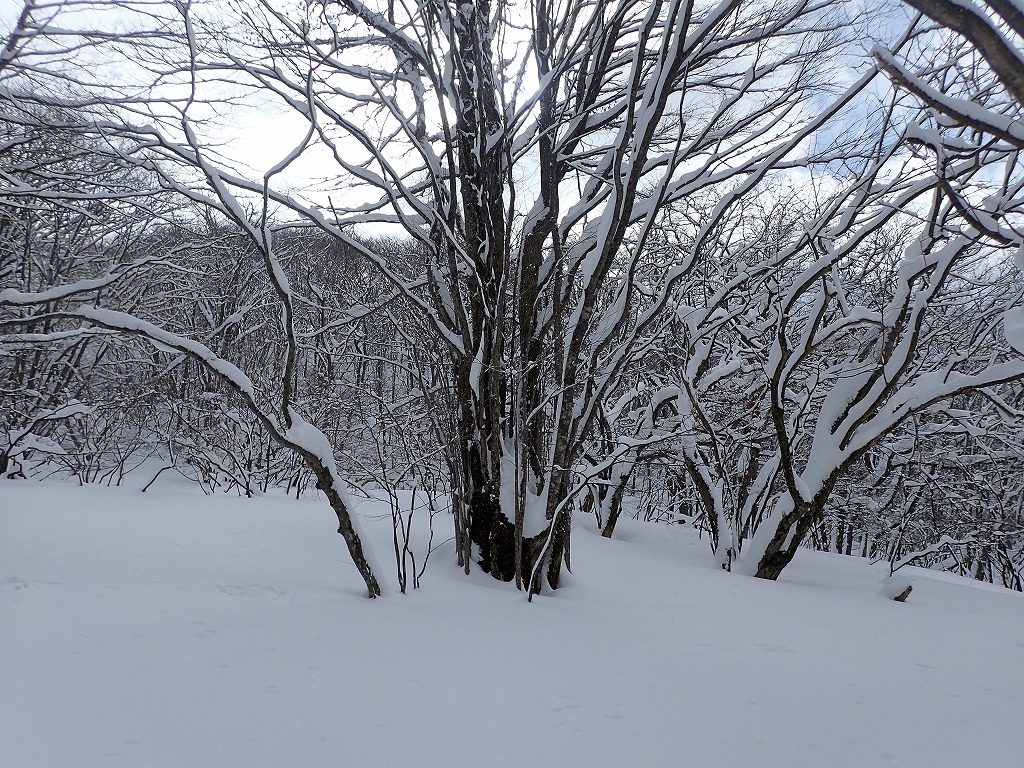 根の平峠の手前のブナ清水との分岐に来た。ブナ清水への道にトレースはない。雪はたんまりだ。これを行ったらどんなことになるだろう。ブナ清水までは結構登るのだ。うーん、頑張っていっても今日はブナ清水までで終わってしまうかもしれない。