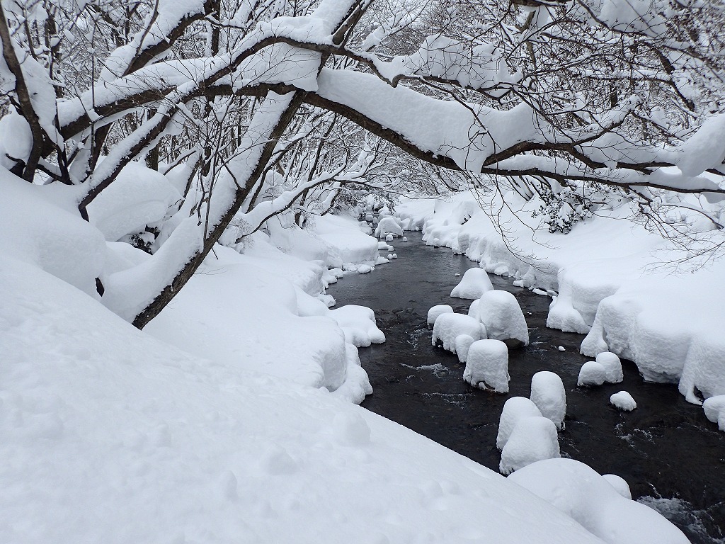 川の中の石の上に積もった雪は今まで見た中で一番多いです。芸術的ですね。