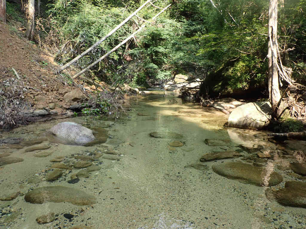 しばらく滝を愛でて下山にかかる。石谷川は登山道がすぐ脇を通っているので下山は楽である。1時間ほどで大堰堤に到着。大堰堤の下に降りるとキャニオニングツアーのガイドたち6人が技術研修をしていた。その脇を通り過ぎ,渡渉して,石水溪バンガロー村に至る登山道に入る。いつもはこのままバンガロー村に降りるのだが,今回は左折して望仙荘に向かう。キャニオニングツアーの人たちが設置した入渓ルートを確認するためだ。苦もなく望仙荘脇に出る。