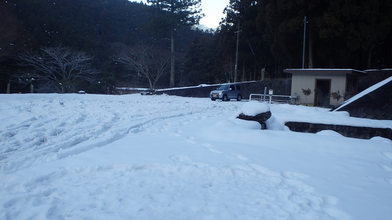 1台の車もない駐車場は半分凍りついた10㎝ほどの残雪がビッシリ。ガシガシと踏み砕いて端っこに駐車する。