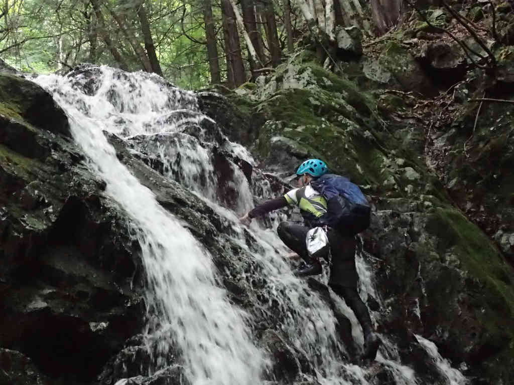 しばらくゴーロを歩くと最初の連瀑帯にでる。10m以内の滝が連なっている。すべてフリーで直登可能なので,こんな楽しいことはない。3人ともボルダリングジムに通っていて,壁を登るのが大好きである。早速,テンションマックスである。これまでは私が先頭を行くことが多かったが,K氏に先に行ってもらい,私は後ろからのんびり行くことにする。