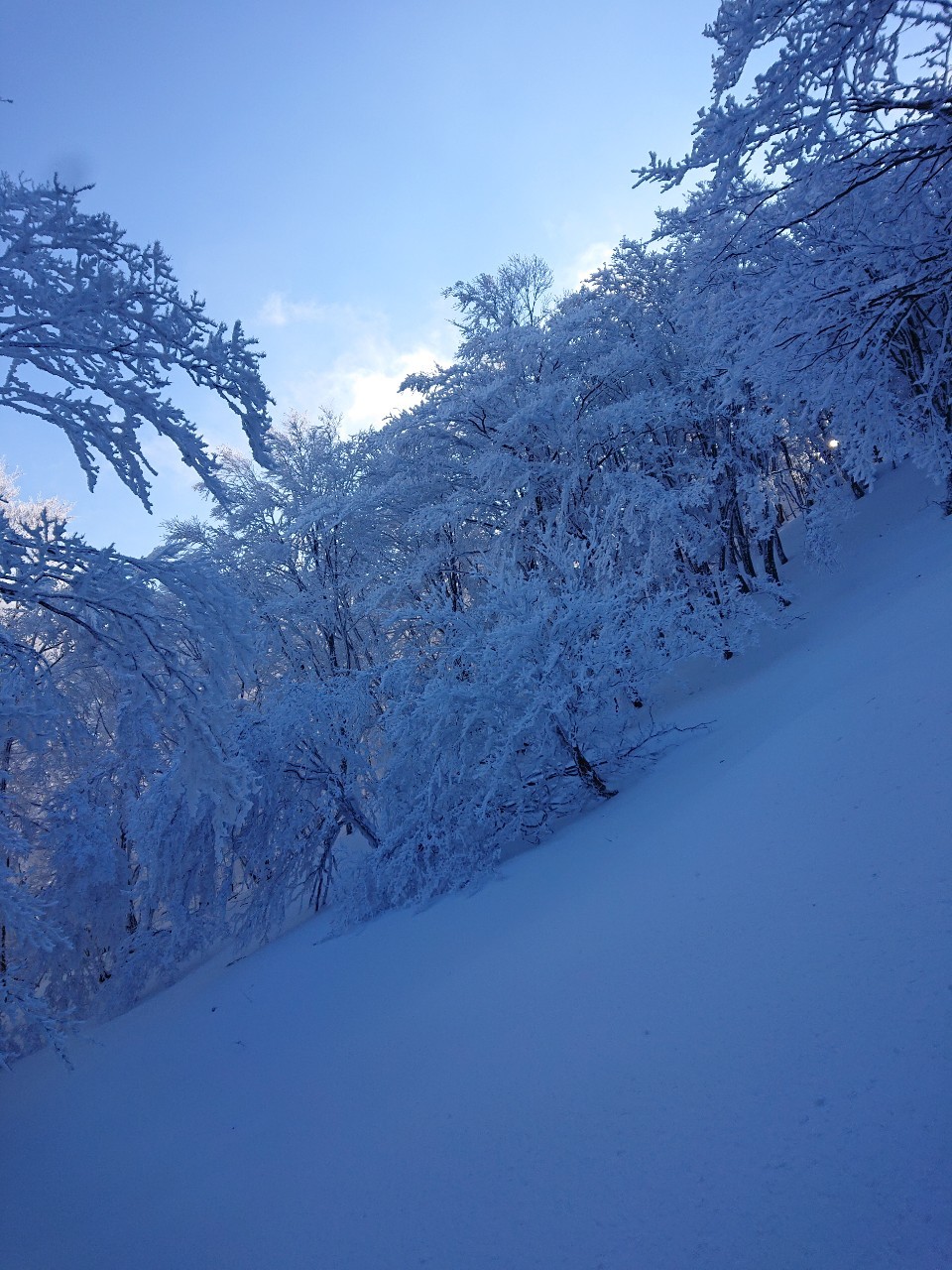 つづら折れに入ると、なんと一面霧氷の世界。前山の稜線もびっしりと霧氷に覆われているではないか。