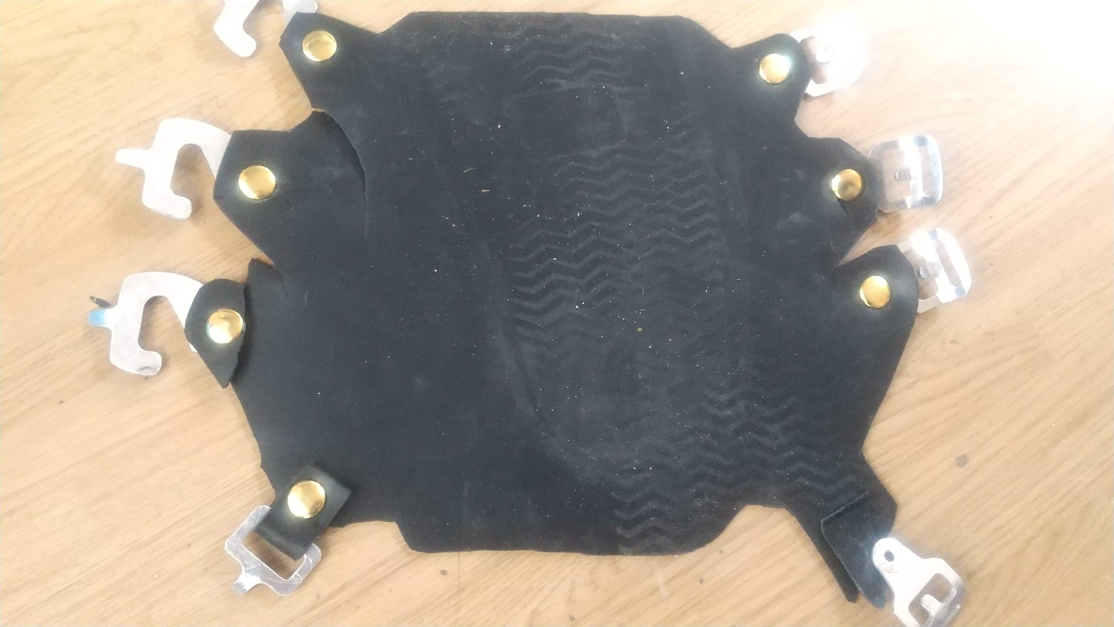 ちなみに第1作目はホームセンターへ行って2mmのゴム板を買って、前もって作っておいた型紙に合わせて切り抜いて金具を装着して、バンドで締めたら見事に裂けるようにゴムがちぎれました。(黒ゴムの画像)